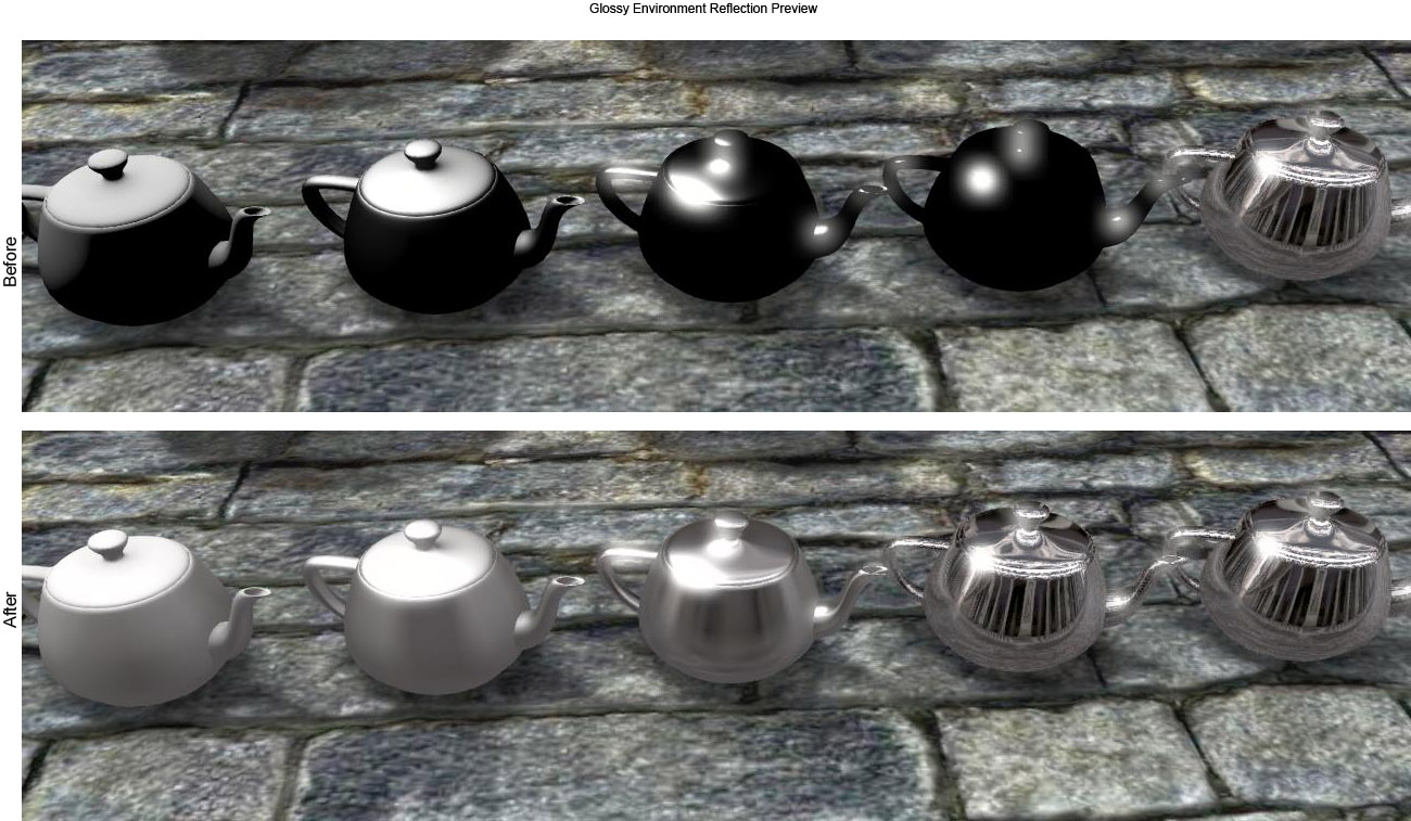 | A series of increasingly shiny teapots, before and after applying this technique. In the before row, only the perfect-mirror (rightmost) teapot reflects the environment. |