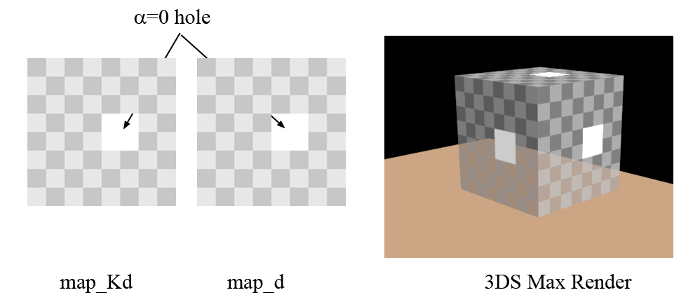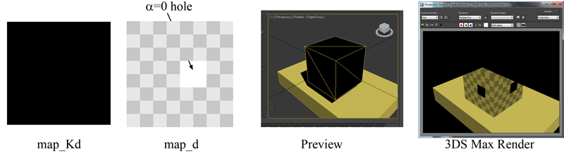 The map_Kd texture map is in RGBA8 PNG format. The white square in the map_Kd has A=0, which you can see is ignored in the render on the far right. The specular highlight on the d=0 part of the map in the right image shows that this is a transmissive coefficient and not partial coverage.