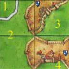 - Cities (brown areas containing buildings). Some cities contain blue-and-white checkered shields; each shield counts as an extra tile when scoring. City tiles entirely consumed by cathedrals have special scoring rules. Ignore the "trade good" icons. Cities are complete when their border walls have no gaps.