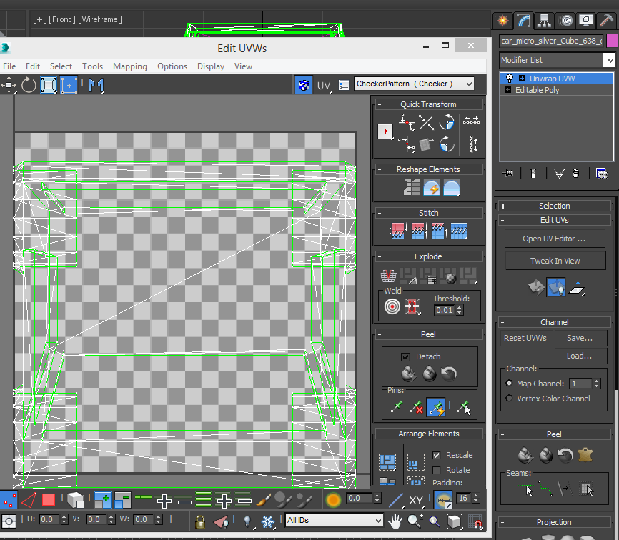 | UVW Editor in the foreground, the Unwrap UVW rollout in the background |