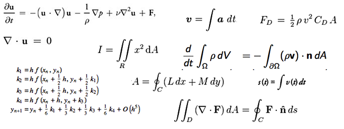 | Typical equations encountered in dynamics algorithms. While the compact notation may be intimidating at first, the key mathematical tools are just integrals and derivatives in 2D spaces. |